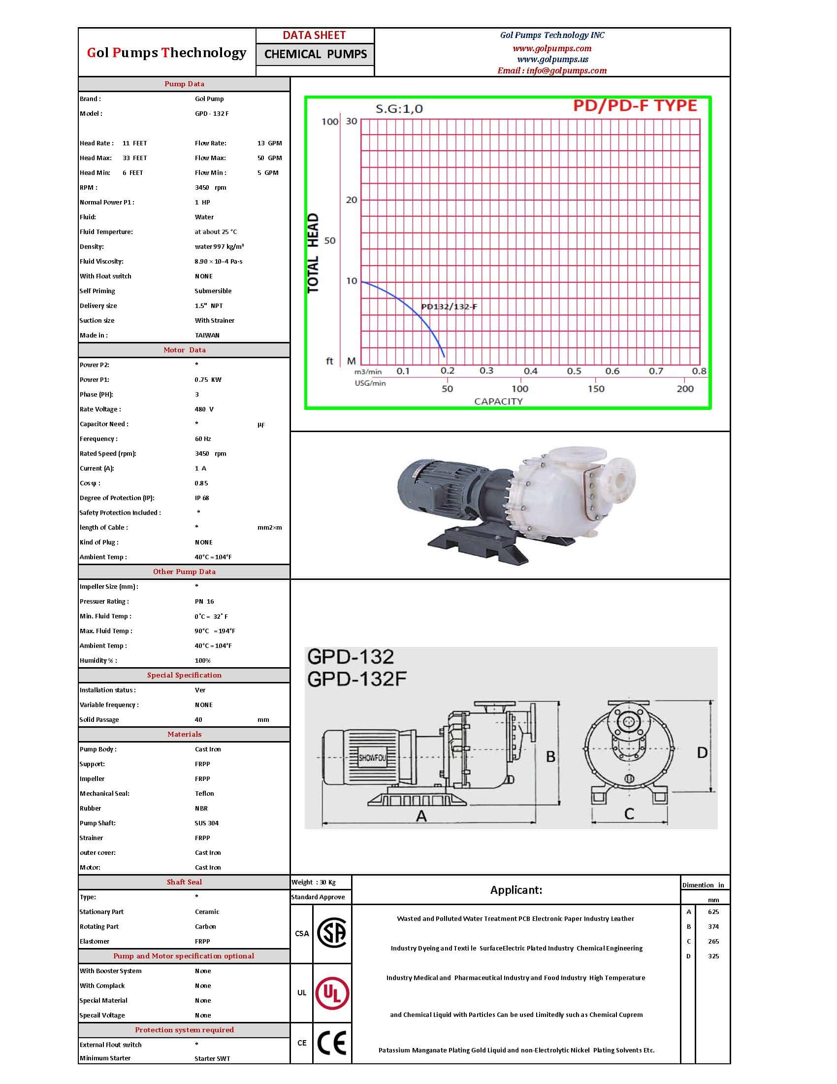 FRPP | PVDF | POWER | PHASE | VOLT | PUMP OUTLET DISCHARGE | GPH | MAX.HEAD | MAX.FLOW | ||