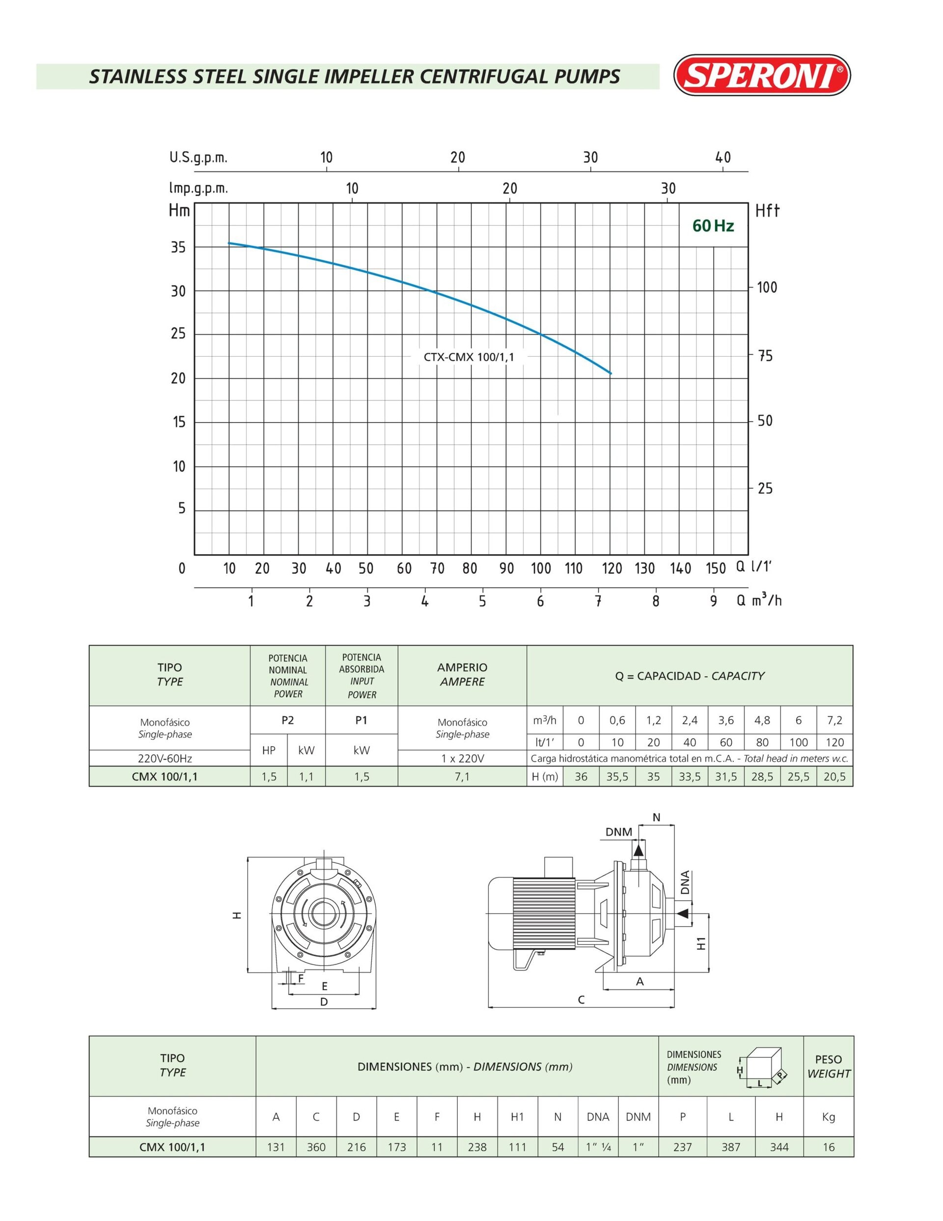 Single Impeller Centrifugal Water Pump 1920 GPH – 1.5HP – CMX100/1.1 – SS304 – 1P